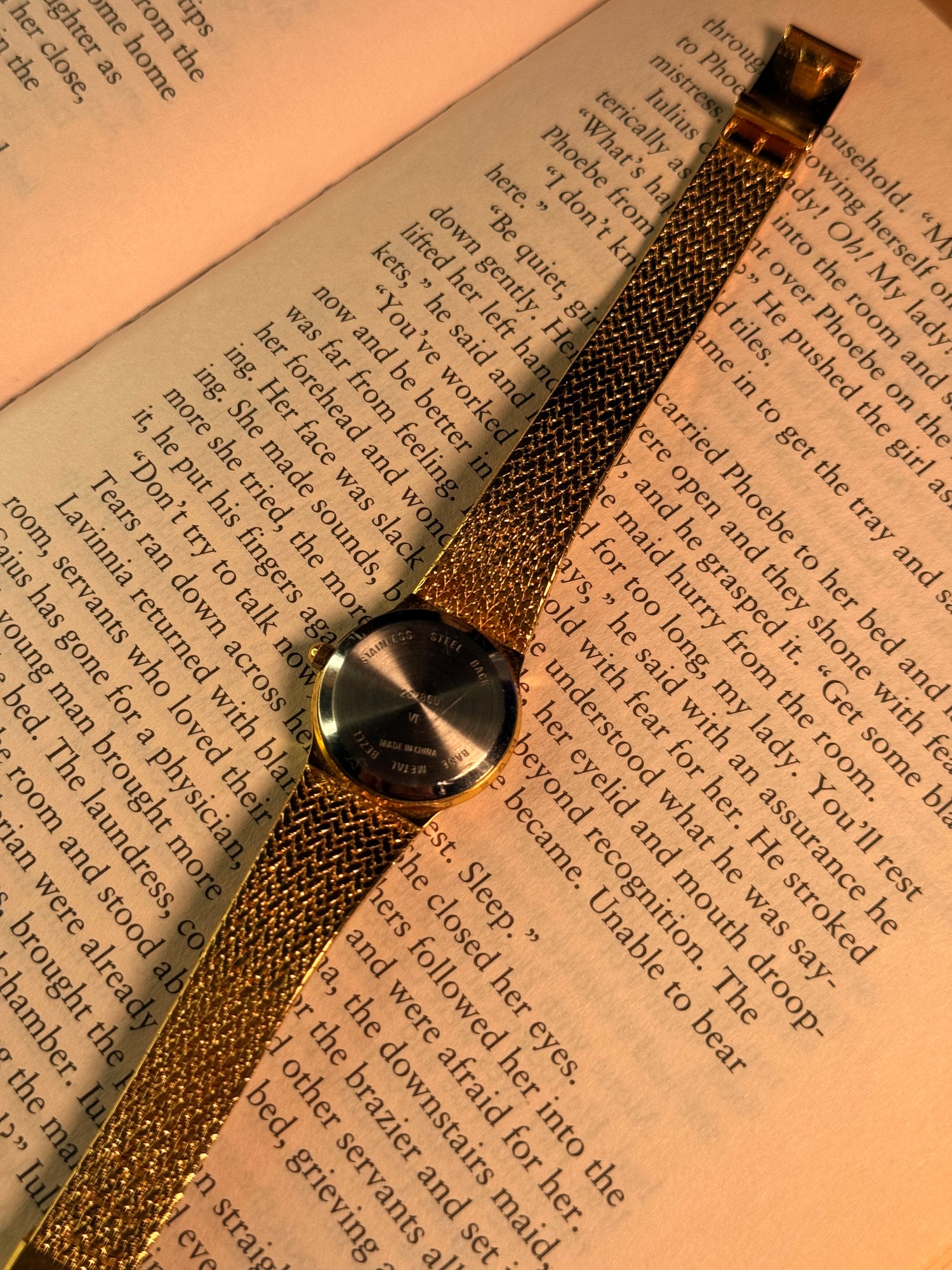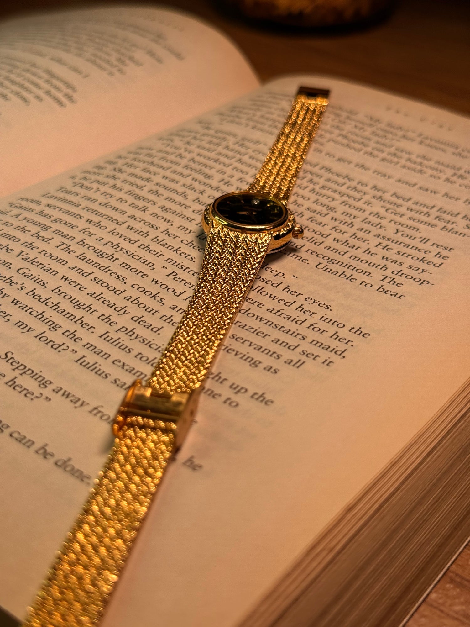 Vintage gold-tone adjustable strap paired with a sleek black face, featuring a diamond marker at 12 o’clock and stick indices.